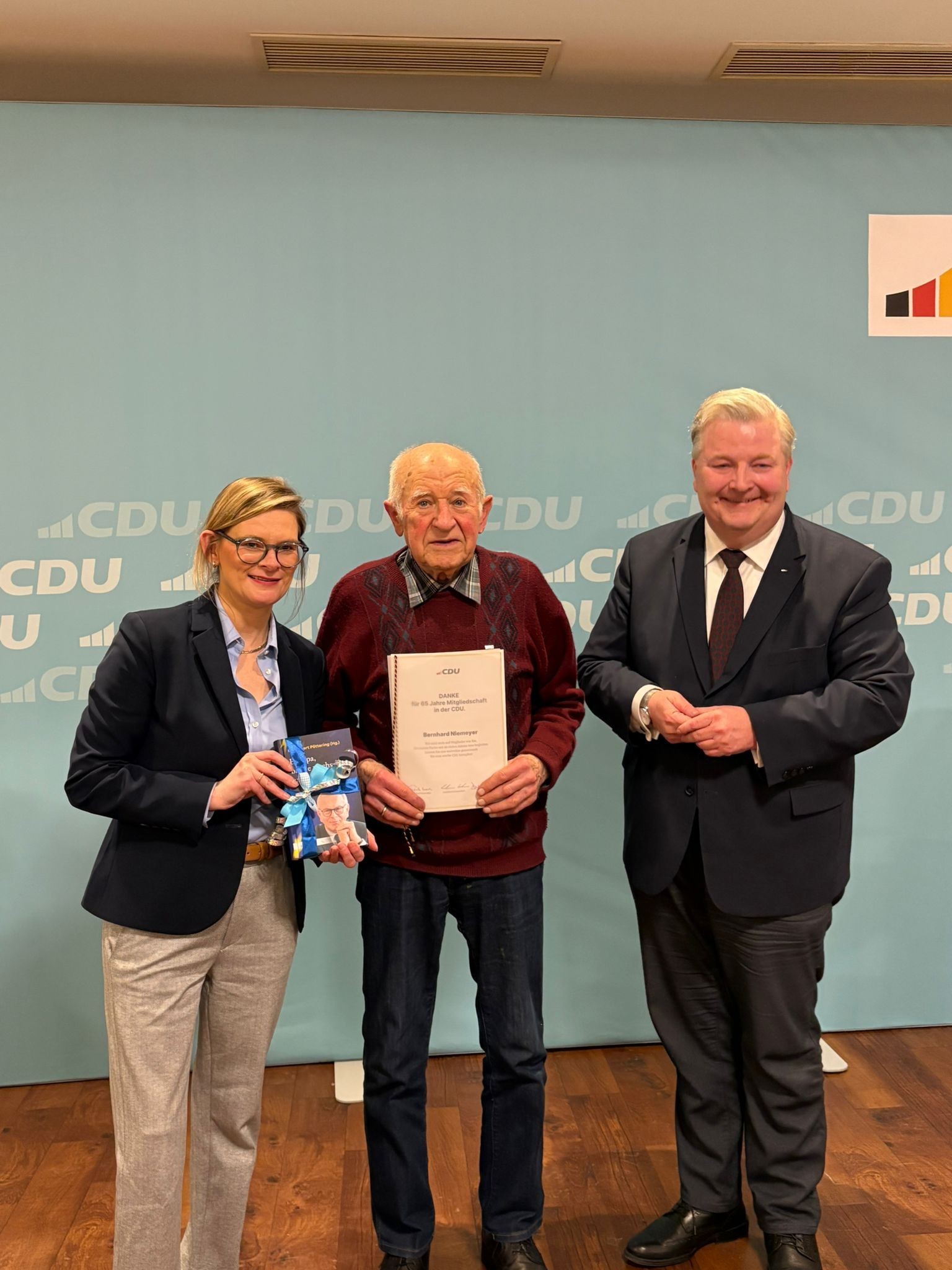 Ein zentraler Programmpunkt des Abends war die Ehrung langjähriger CDU-Mitglieder. Für ihre 50-jährige Mitgliedschaft wurden Thea Kötter aus Haren (Ems), Gert Wessels aus Meppen, sowie Bernhard Aehlen aus Twist ausgezeichnet. Eine besondere Würdigung erhielt der 95-jährige Bernhard Niemeyer aus Geeste, der für seine 65-jährige Mitgliedschaft geehrt wurde. Die CDU dankte den Geehrten für ihre jahrzehntelange Treue und ihr Engagement für die Partei.